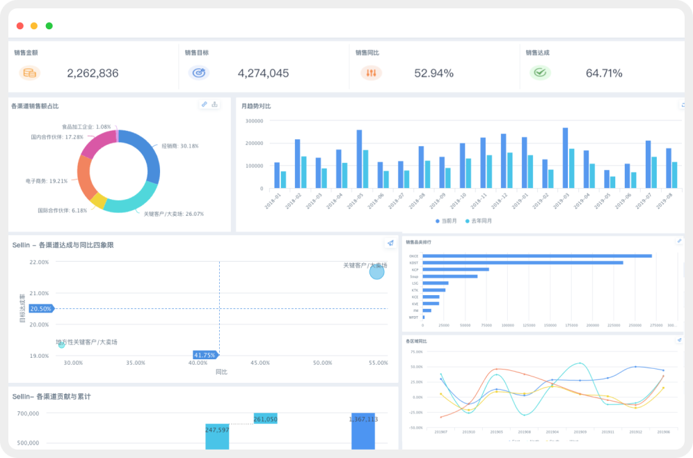 丰富易用的可视化图表,自助式构建多维分析页面