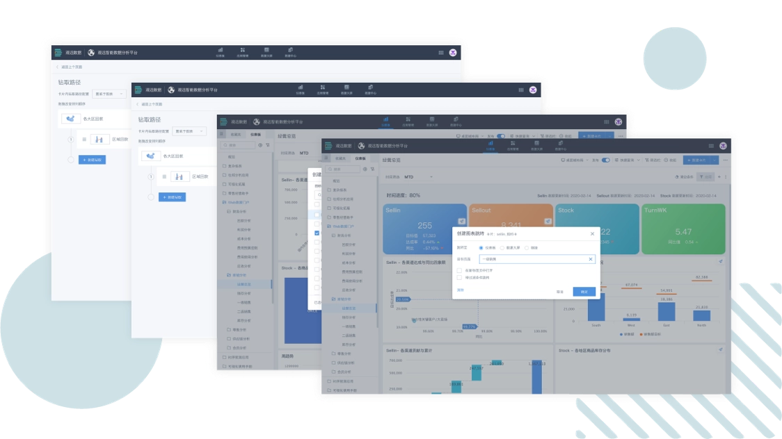 - 交互式数据分析:图表可进行多层钻取、图表跳转、多表联动等交互操作,可追溯数据根源,便于快速定位与解决问题,为业务增长机会的数据探索打好基础,灵活的数据权限隔离,对企业数据安全加强保护。