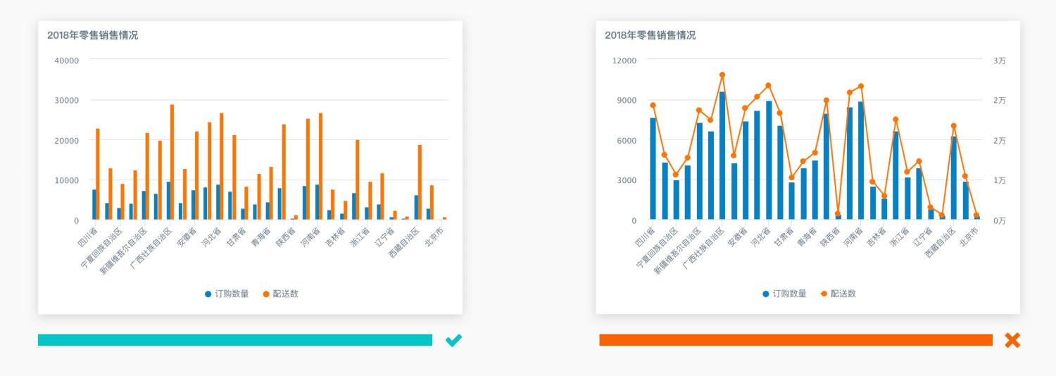 线图主要用于表达连续或具有变化关系的数据。若想要表达两个不同维度的数据时,不能简单地用柱图/线图进行区分,可采用柱图的方式,并且使用不同的颜色映射。