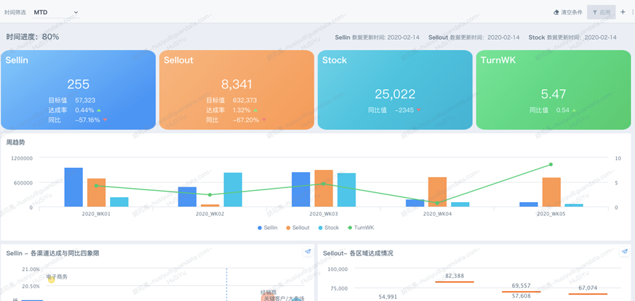 销售主题分析包括销售组织分析、新品上市分析、重点产品分析、重点区域分析、门店销售分析、终端质量分析、经销商进销存分析、经销商管理分析、销售团队效力达成、销售团队拜访分析、市场窜货情况分析、异常用户分析、异常出库分析等13个看板。通过以上驱动销售的关键指标分析,让集团运营管理层能够快速了解销售状况。通过现代化BI工具特有的交互、下钻功能,清晰洞察业务变化根源,对销售状况佳或不佳的内容,及时作出针对性运营决策,以扩大销售战果。