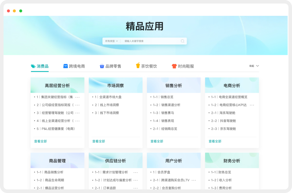 统一应用入口,满足千人千面的个性化看数需求, 清晰、直观、美观且沉浸式的Web端看数体验